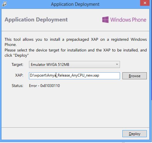 我开发了wp8应用程序,并使用powershell.After成功地签署了企业证书,我试图在模拟器中部署我的签名应用程序,但我收到了错误,