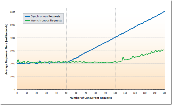 结果说明了异步请求是如何执行的。查看这个平均响应时间与并发请求数量的关系图(较低的响应时间更好):