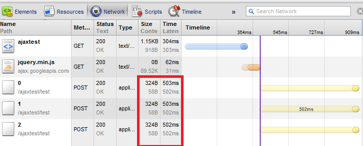 让我们看一个示例;一个页面向服务器发出3个异步AJAX请求,并且启用了会话状态(还请注意,会话必须实际使用,因为如果您从未使用会话状态,即使启用了会话状态,ASP.NET也不会对请求进行序列化)。