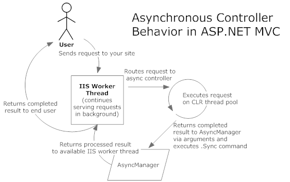 首先,控制器开始一个或多个外部I/O调用(例如,SQL数据库调用或web服务调用)。在不等待它们完成的情况下,它将线程释放回ASP.NET工作线程池,以便它能够处理其他请求。