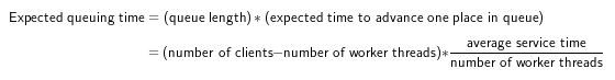要理解这一点,首先我需要告诉您,我已经将我的ASP.NET MVC应用程序的工作线程池设置为人工设置的50个工作线程的上限。我的服务器实际上有一个默认的最大线程池大小为200 --这是一个更合理的限制--但是如果我减少它,结果会变得更清楚。如您所见,只要有足够多的工作线程,同步请求和异步请求的执行情况就完全相同。为什么他们不应该呢?但是,一旦线程池耗尽(> 50个客户机),同步请求就必须形成一个要服务的队列。基本排队论告诉我们,排队等候的平均时间由公式给出: