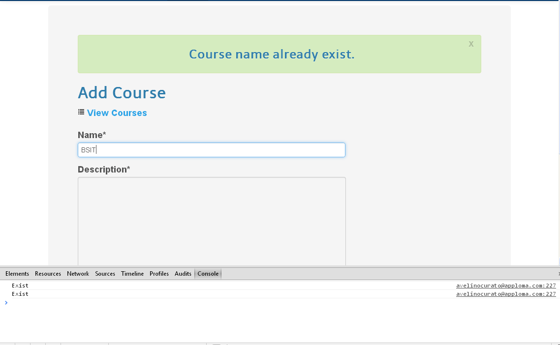 如果课程名称已经存在,我已经使用ajax的key函数在我的数据库中签入了。在找到匹配后,将向用户显示一个提示。我在模型中使用了不同的查询,然后控制器将正确的值返回给ajax,但是返回的值被复制,甚至返回多个值,导致页面中的弹出消息也会多次显示。这是怎么回事?谢谢help.Here是我的密码