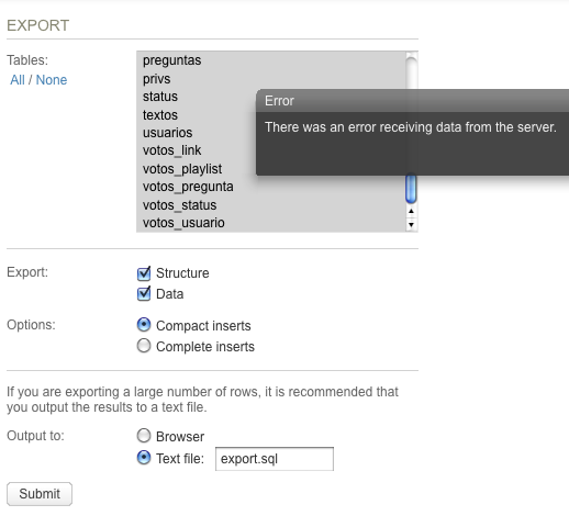 另外,如果我试图通过例如sqlBuddy导出数据库,我也会得到错误: