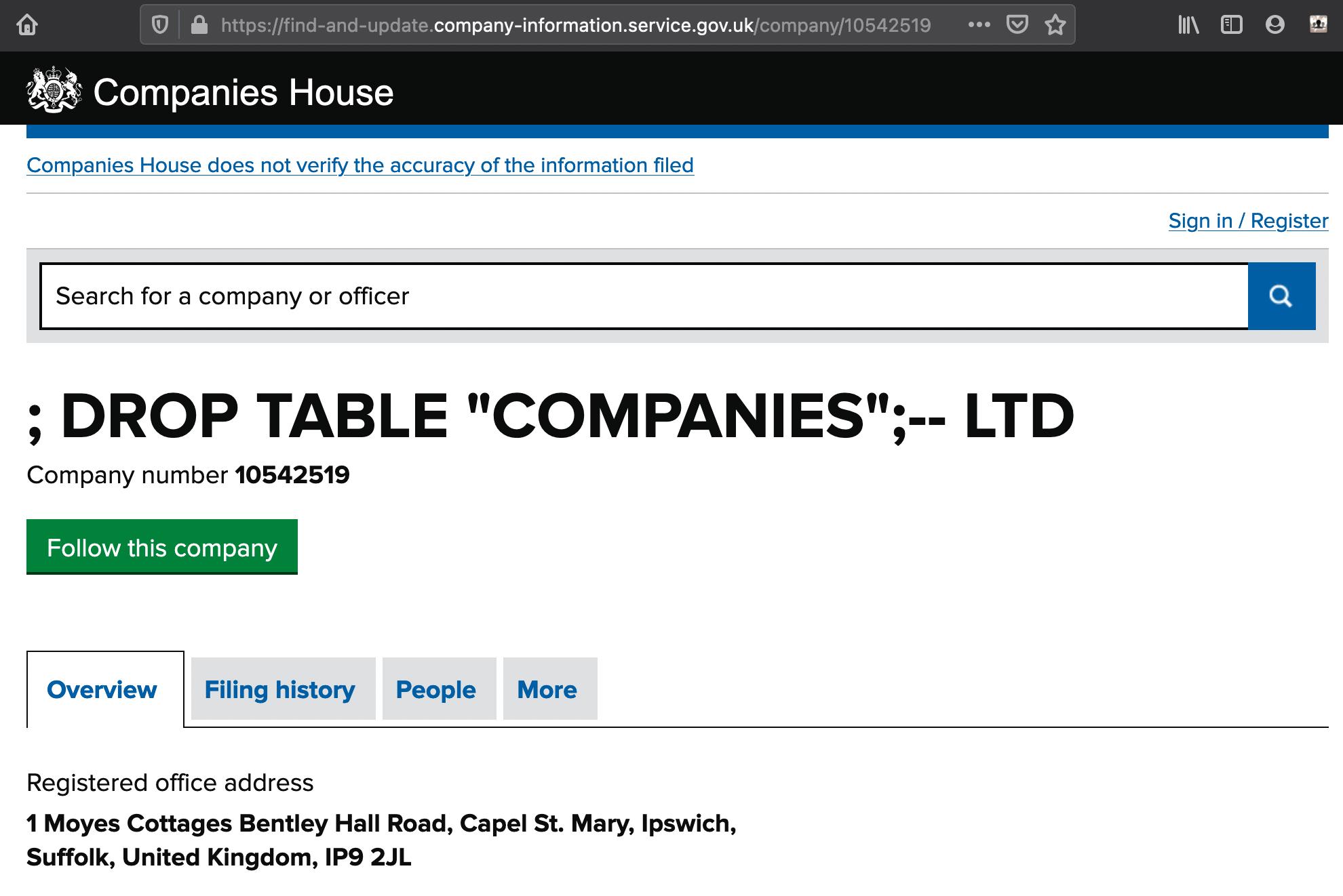 由于公司仍然上市,攻击似乎是不成功的,然而,如果注入成功在未来,我也将包括一个屏幕截图。