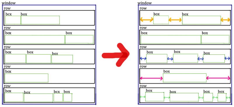 同样颜色的箭头(间距)应该有相同的宽度。(对于图片中的第二行,间距仅为0。窗口(和所有其他行)的宽度与其宽度一致)