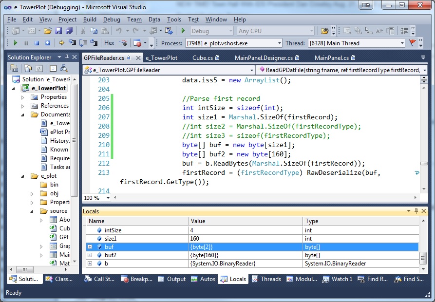 我试图在C#中序列化一个对象。我得到了对象的大小,并将其保存在一个变量中,在上面的屏幕截图中,size1在第207行。Size1的值为160。然后,我使用size1在第210行中分配一个名为buf的字节数组。Buf是一个2字节的数组!这怎么可能?!