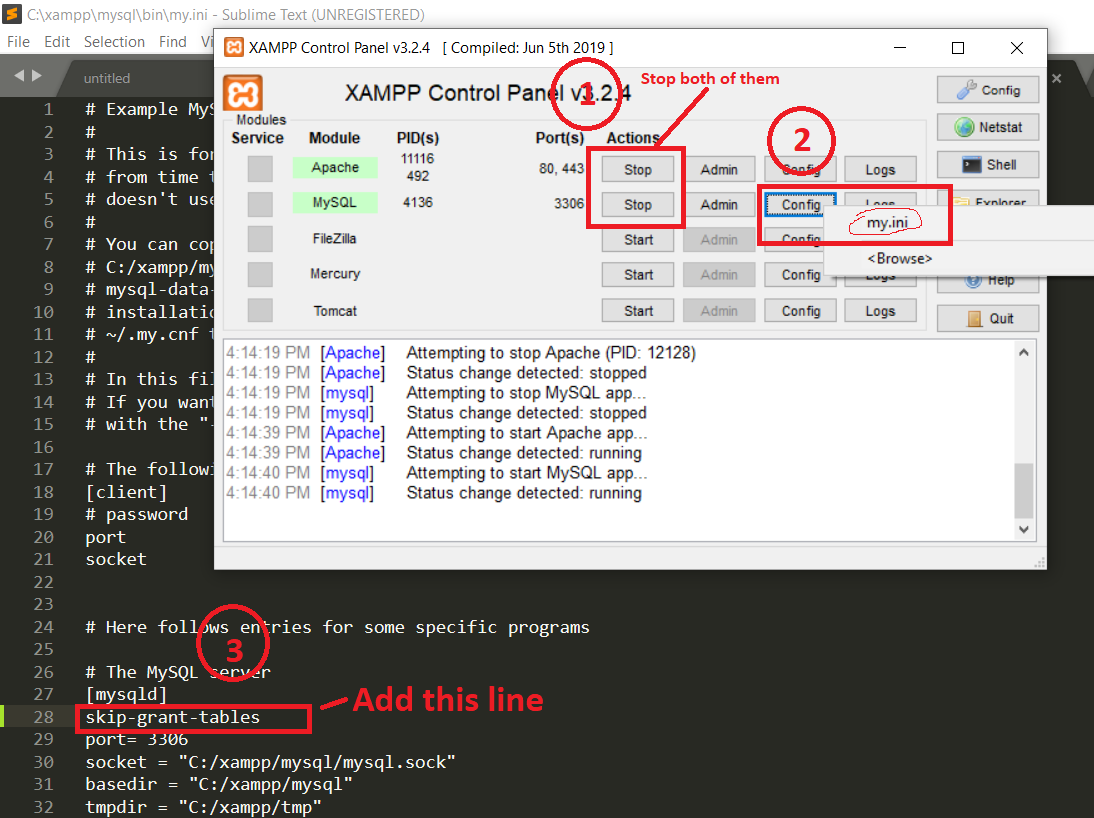 您可以将skip-grant-tables添加到[mysqld]标记的# The MySQL server下的my.ini文件中,并重新启动mysql服务器。