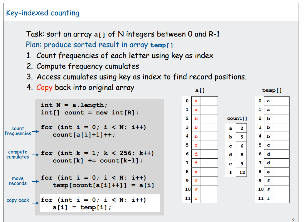 我知道,在我们累积计数后,它们应该是某种抵消。这样我们就可以在temp[]中适当的位置插入字母。