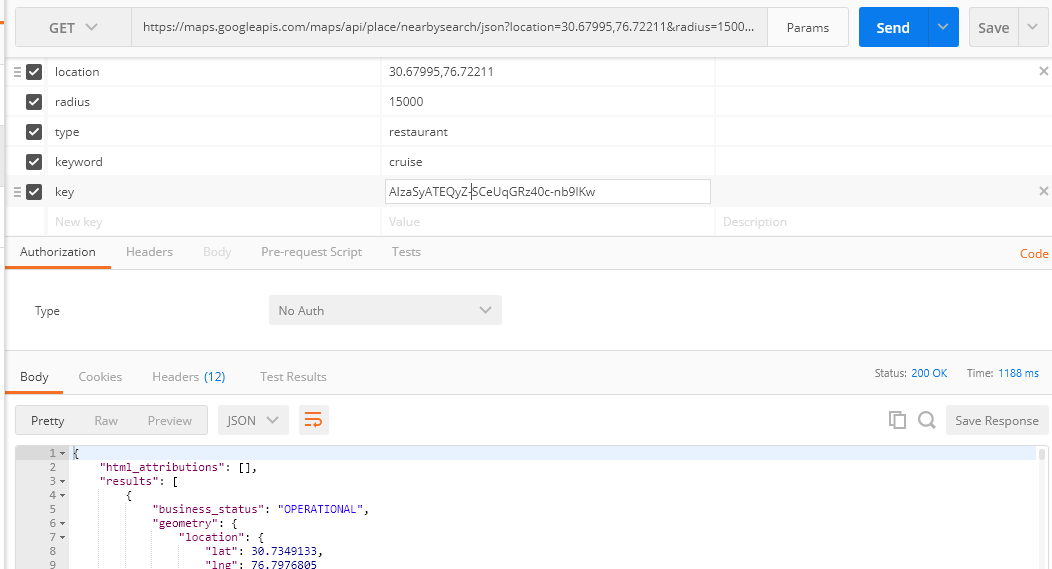 https://maps.googleapis.com/maps/api/place/nearbysearch/json?location=30.67995,76.72211&radius=15000&type=restaurant&keyword=cruise&key=YOUR_API_KEY