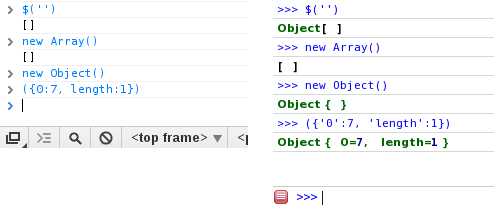 这些属性是否位于对象本身或其原型中并不重要。您可以将此代码粘贴到任一控制台中,它将显示与上面代码相同的类似数组的表示法: