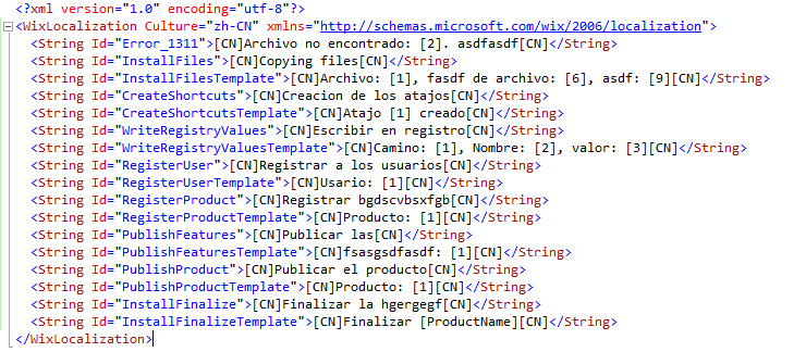 </Wix>伴随这个例子,您必须有一个本地化文件为您的文化。您必须在Build->Cultures to build下的项目属性中设置区域性。在我的例子中,我将它命名为es-es.wxl,文件内容如下:
