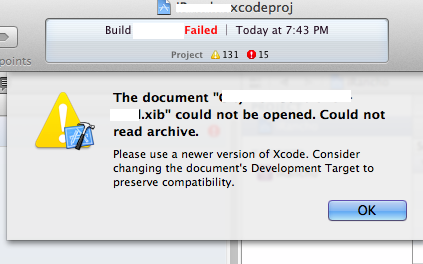 The document "DetailTransactionPage.xib" could not be opened. Could not read archive.