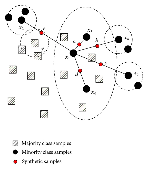 在算法的每一次迭代中,SMOTE考虑少数类的两个随机实例,并在中间添加一个相同类的人工示例。该算法一直将样本注入数据集,直到两个类变得平衡或其他一些标准(例如,添加一定数量的示例)。下面可以找到一幅图片,描述该算法在2D特征空间中对简单数据集所做的工作。