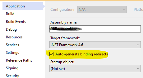 请在Visual的项目属性窗口中使用Auto-generate binding redirects