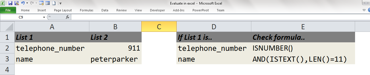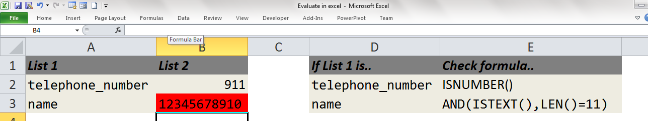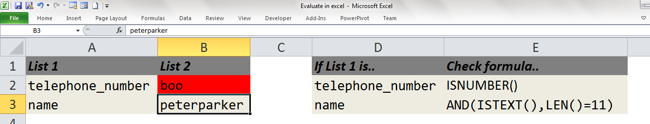 =IF(A1="telephone_number";ISNUMBER(B1);IF(A1="name";LEN(B1)=8;TRUE))这是B1中单元格的示例。您可以选择一个更宽的范围,并结合$,以使您的公式适合所有范围。