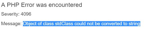 Catchable fatal error: Object of class stdClass could not be converted to string in我正在学习PHP的基础知识。有人能建议如何解决这个问题吗?