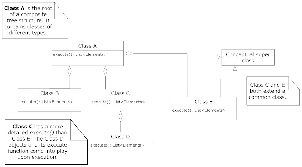 您的例子有点模糊,因此很难完全理解您的意思,但是,我认为将execute()函数分解成一个单独的接口,将其转换为一个策略,并允许将该策略注入到A类(复合的根)是一种解决方案。然后,A类可以将策略注入到正在组合的其他对象。