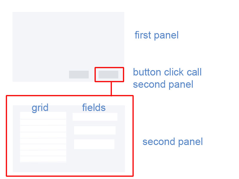 我扩展了Ext.form.FormPanel。它包含有按钮的first panel和按一下按钮呈现的second panel。就像在照片上: