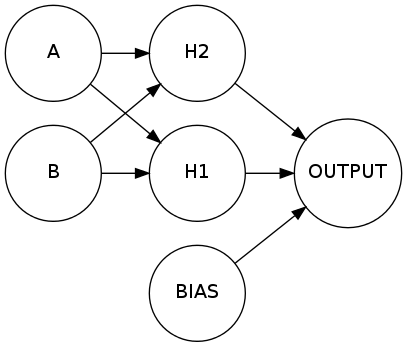 神经网络看起来像上面的图片吗?它看起来像一个普通的XOR拓扑,有一个隐藏层和一个偏置神经元。偏置神经元基本上可以帮助你将激活函数的值向左或右移动。