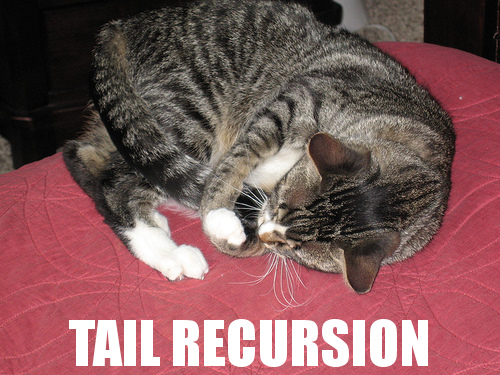 最后,尝试使用尾递归而不是循环或普通递归,因为它肯定不会杀死堆栈。但是当你能做得更好的时候,就毫不犹豫地把它做得更好。
