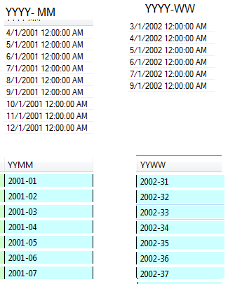 我有两栏的日期。一个值的格式是年份和月份(YYYY),另一个是年份和周(YYYY)。