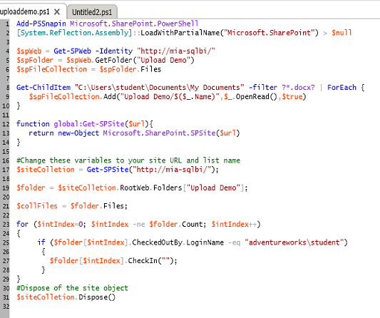 我在服务器上成功地运行了这个脚本。它使用C:\Users\student\Documents\My Documents文件扩展名为docx将所有文档上传到一个名为Upload Demo的文档库。上传后,检查该库中的所有文档。
