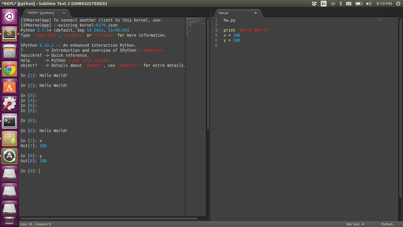 基本上,在获得崇高文本2和sumblimeREPL并运行之后,我在发送代码时遇到了问题。例如,在下面的屏幕截图中,我按行(ctrl+,l)或块/选择输入左行的代码,但是除了输出什么都没有显示。在3-6中,我试图只运行x和y行。这就是你想要的行为吗?我会假设是的,除非所有的输出都显示在输入行上。到目前为止,我尝试过的唯一一种语言是R,它没有这个问题。而且,在python和ipython中都存在相同的问题。有什么想法吗?