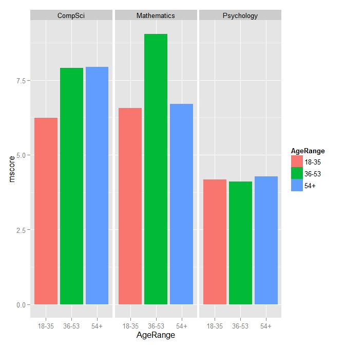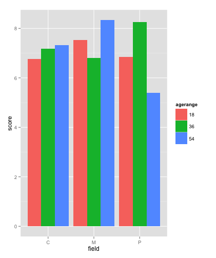 p<-ggplot(df, aes(x=field,y=score, fill=agerange))