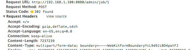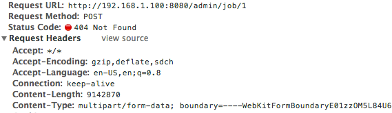 192.168.1.144 - - [14/Jan/2014:10:45:01 -0500] "POST /admin/job/1 HTTP/1.1" 404 223 "http://192.168.1.100:8080/admin/job/1/edit" "Mozilla/5.0 (Macintosh; Intel Mac OS X 10_9_1) AppleWebKit/537.36 (KHTML, like Gecko) Chrome/31.0.1650.63 Safari/537.36" "-"附件是在铬控制台的图像。