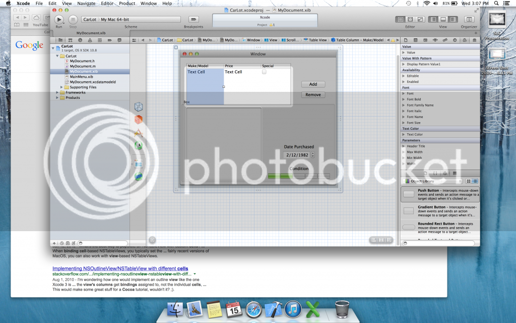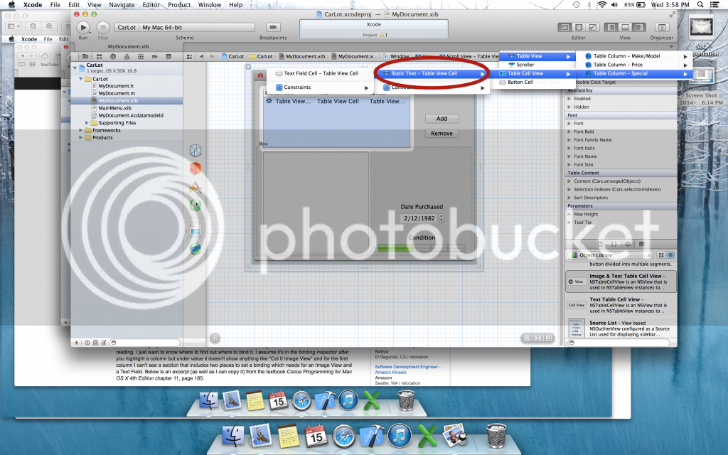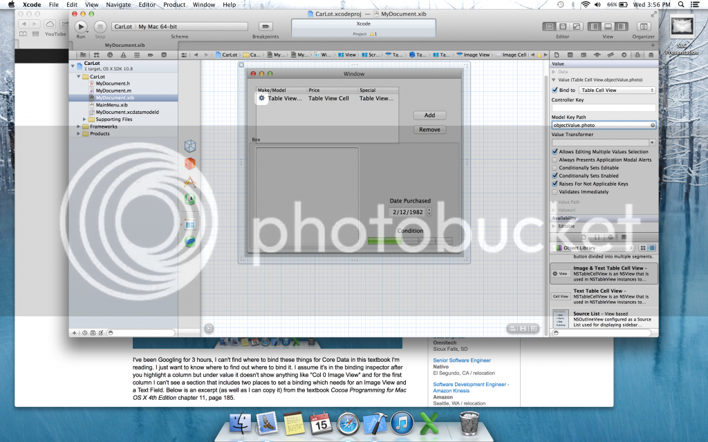 我已经在谷歌上搜索了3个小时了,在我正在读的这本教科书里,我找不到把这些东西绑定到核心数据的地方。我只想知道哪里能找到绑定它的地方。在突出显示列之后,我假设它在绑定检查器中,但是在值下面,它没有显示任何类似"Col 0 Image View“的内容,对于第一列,我看不到包含设置绑定的两个位置的部分,而绑定需要一个图像视图和一个文本字段。下面是一个摘录(以及我可以复制它)从教科书Cocoa编程的Mac第4版,第11章,第185页。