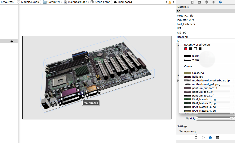 纹理位置设置为“相对于DAE文档”,得到以下(正确)路径:../../Textures.bundle/ModelTextures/Computer/motherboard_motherboard.jpg