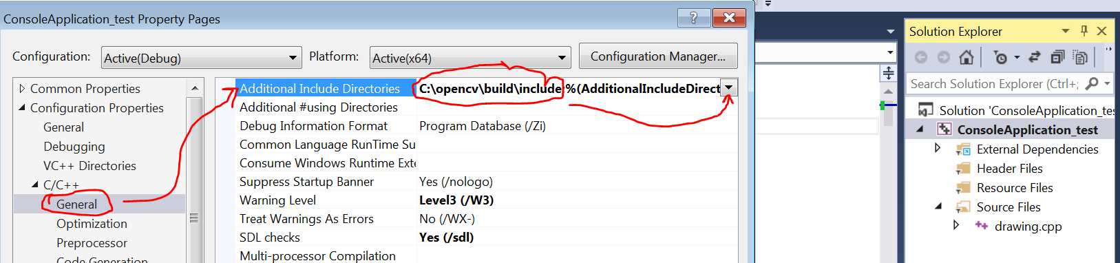 项目属性=> C/C++ =>通用=>附加包含目录=>“将库地址放在openCV文件夹中,如下图所示:C:\opencv\build\=>
