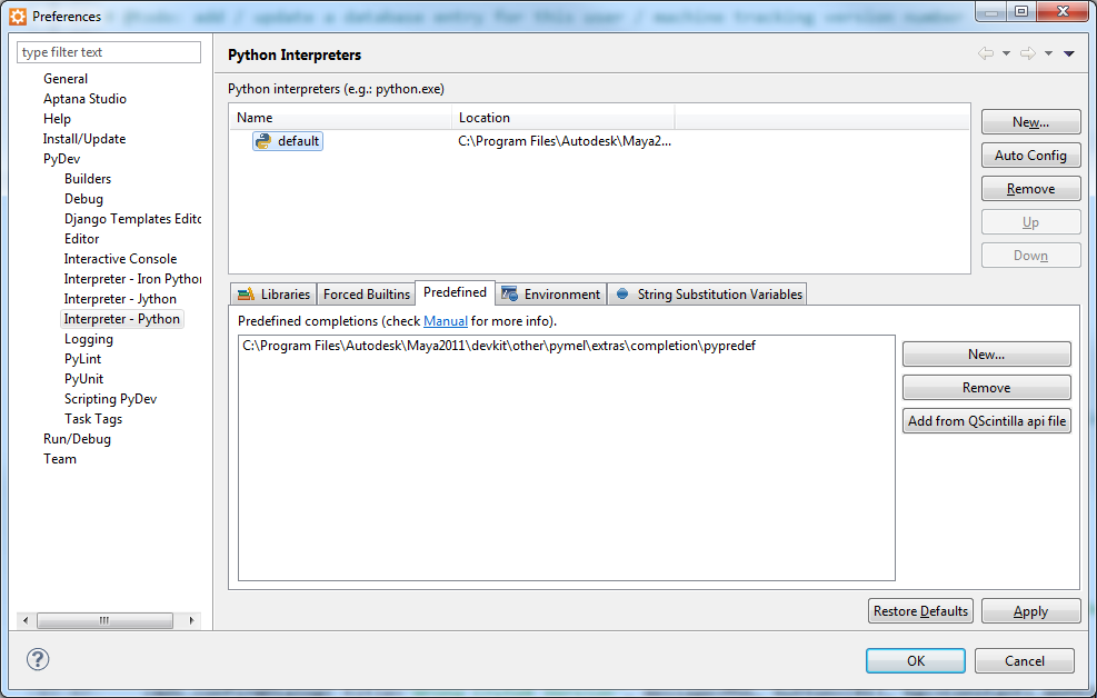基本上,您希望确保您的解释器知道maya目录和pypredef文件夹在maya安装中的位置。这是我设计的照片。这是我的Maya解释器的Libraries选项卡: