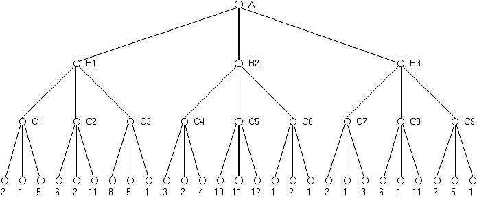 2) Max预测,Min会把Max放在最坏的位置(将Max限制在最小的效用),所以B1=5,B2=2,B3=3