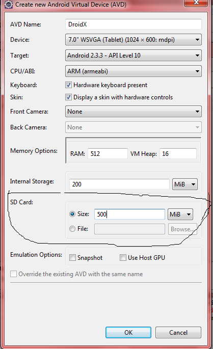 如果您没有在DDMS中找到SD卡,那么您可能没有为SD卡分配空间,如果是这样的话,那么按下面的方式添加