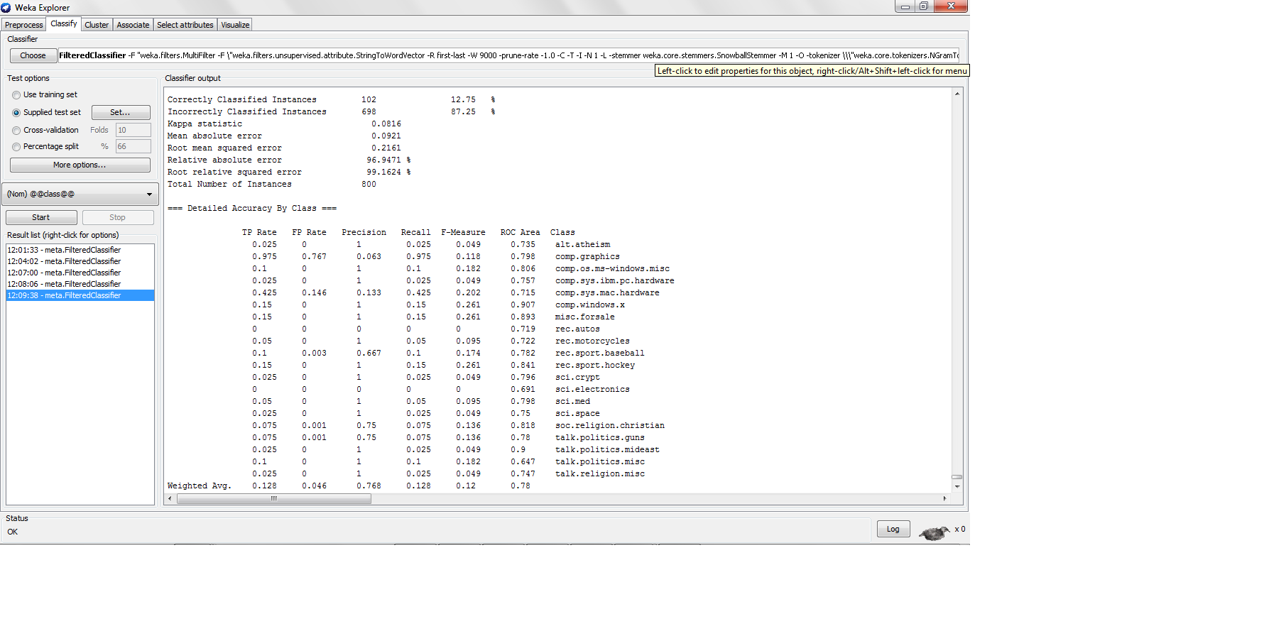 我使用k-nn对20 nn数据集进行了分类,每个类别中有200个实例,其中有80-20次列车测试分割,其中我发现了以下结果