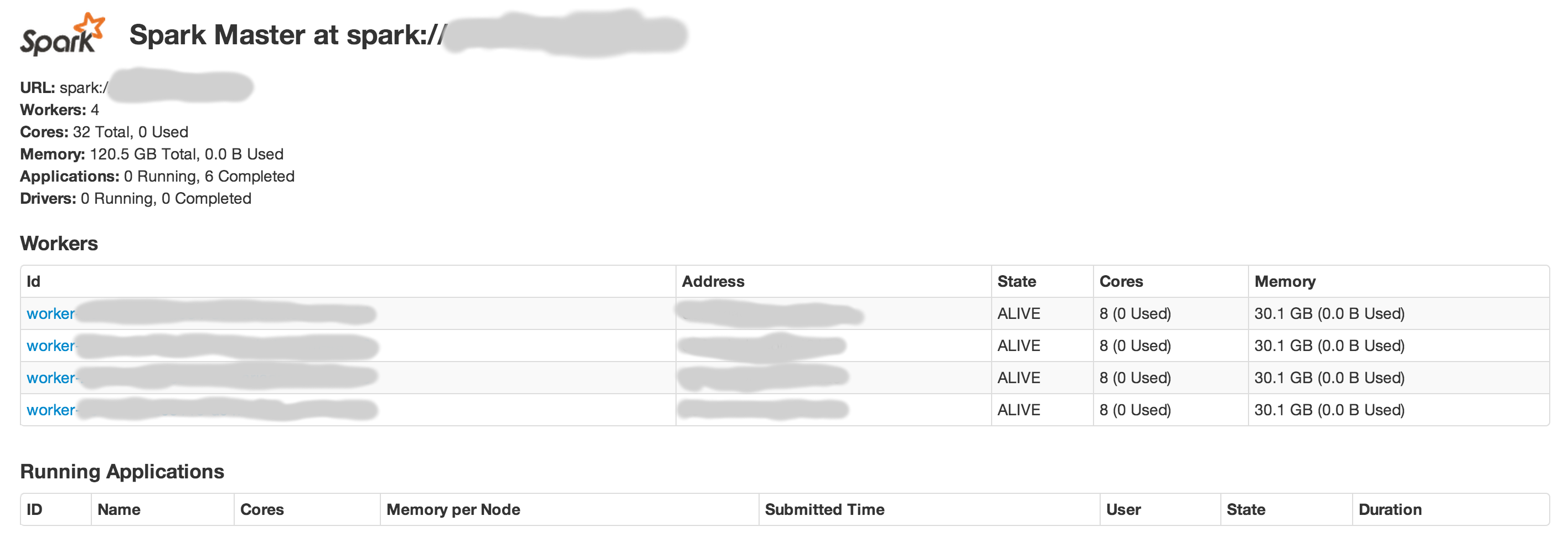 检查主节点上的Spark (默认情况下由SPARK_MASTER_WEBUI_PORT在spark-env.sh中指定端口,8080 )。它应该是这样的: