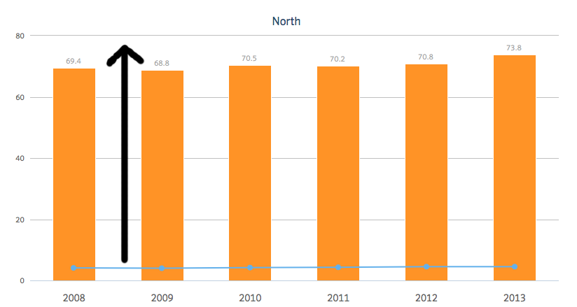 线在图表的底部,因为数字很低(在5-10%之间)。列的数字约为80%,因此它们达到了图表的顶端。这是正常的行为。