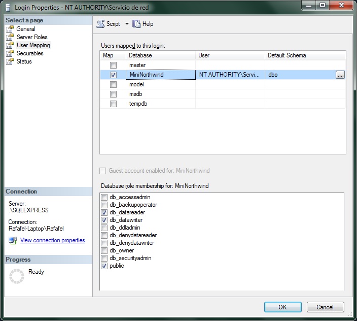 现在打开帐户的属性,转到userMapping,然后选择要连接的数据库,然后检查要为所选数据库使用的角色成员资格服务,单击“确定”。(对于网络服务,即intranet用户,您也需要为NT权限\系统用户配置上述设置)