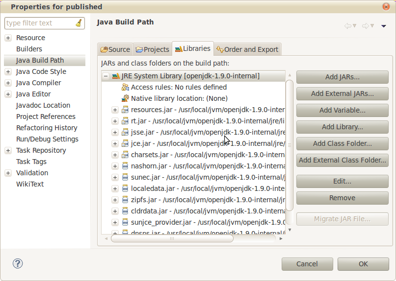 我想用我相当古老的openJdk9存储库来尝试最新的Java。我下载、构建并安装了它,一切都很好。然后,我将其设置为Eclipse的默认JVM,所有内容都被重新编译,但是由于找不到像java.lang.CharSequence这样的基类,所以出现了错误。
