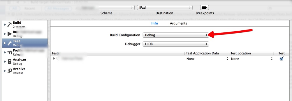 Hmm 100%注意到eph515关于调试符号是可见的,但是您也可能想要检查是否有人将您的方案的测试操作设置为在Release或其他配置中构建。单击“方案选择器”和“选择编辑方案”。单击测试操作,然后确保构建配置为Debug。