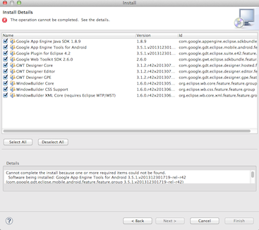 我正在使用OSx10.9.1,我需要安装google插件,用于eclipse,,用于使用google工具包。我有eclipse juno,所以我只需按照链接来安装它。但这对我不起作用,不能继续下去,因为下面这个问题