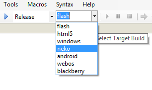 对于第二个问题,如果您创建了一个openfl项目,它看起来就像这样,并且确实是这样做的,那么在flashdevelop的顶部有一个下拉菜单: