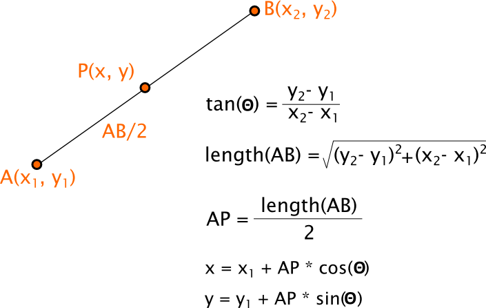 我使用以下公式计算坐标(请注意,我不能使用中点公式,因为距离可能会变化)。