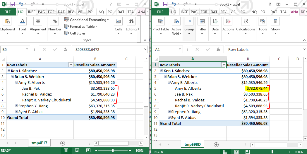 使用NonLeafDataHidden (左),与“艾米E.艾伯茨”的孩子相关的值加起来不等于15.5mm的小计。