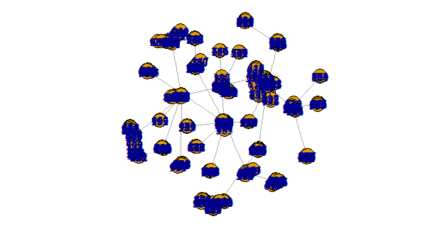 mem <- data.frame(vertices = 1:vcount(g), memeber = as.numeric(membership(c_g)))海事组织,这是一个很好的方法,有两个原因。首先,它可以在理论上处理任意大小的图形。发现社区的过程可以在折叠图上不断重复。第二,采用交互式方法将产生非常可读的结果。例如,可以想象用户可以单击折叠图中的一个顶点来扩展该社区,显示其所有原始顶点。