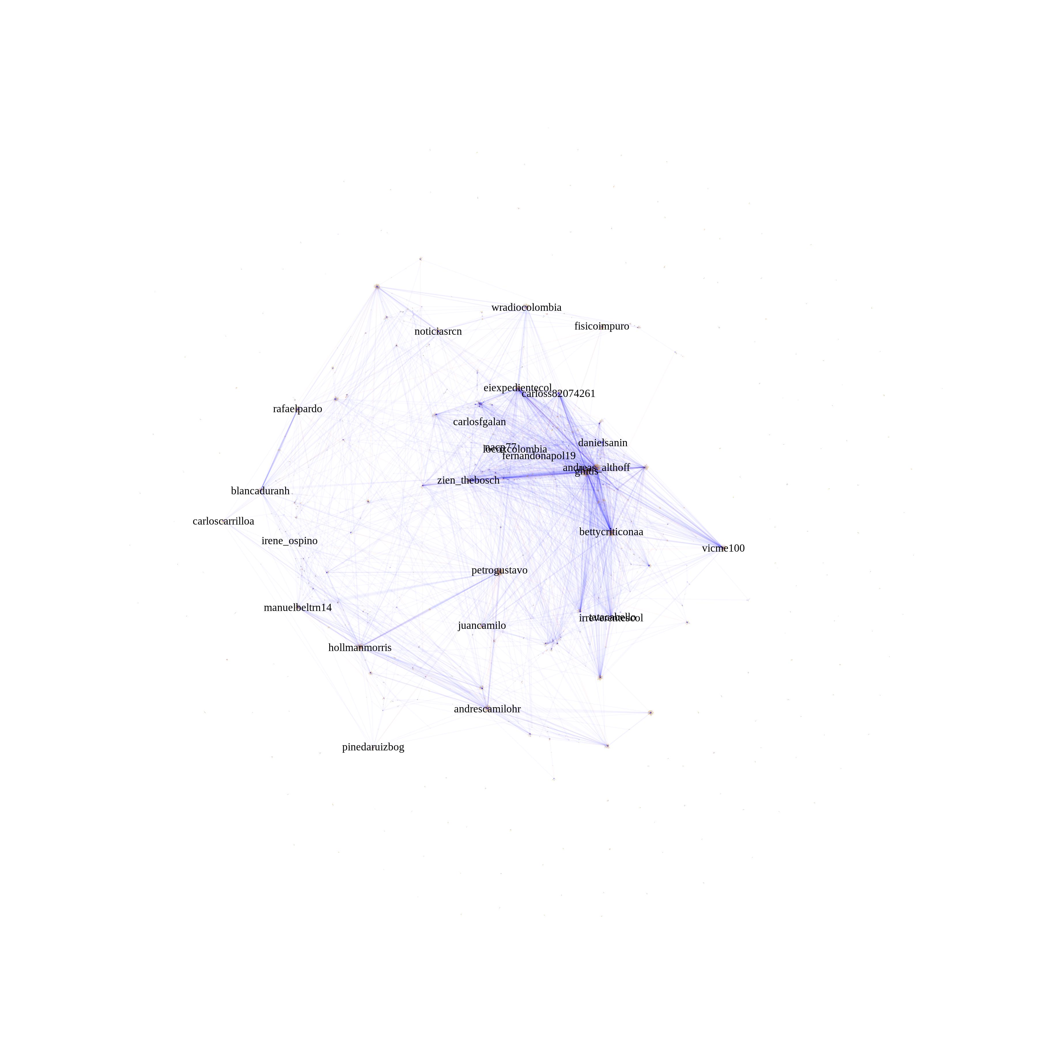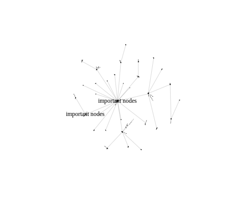plot(simplify(g), vertex.size= 0.01,edge.arrow.size=0.001,vertex.label.cex = 0.75,vertex.label.color = "black" ,vertex.frame.color = adjustcolor("white", alpha.f = 0),vertex.color = adjustcolor("white", alpha.f = 0),edge.color=adjustcolor(1, alpha.f = 0.15),display.isolates=FALSE,vertex.label=ifelse(page_rank(g)$vector > 0.1 , "important nodes", NA))