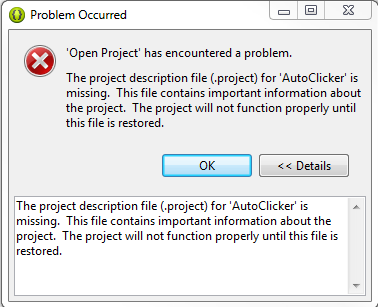 缺少“AutoClicker”的项目描述文件(AutoClicker)。此文件包含有关项目的重要信息。在此文件恢复之前,项目将无法正常工作。