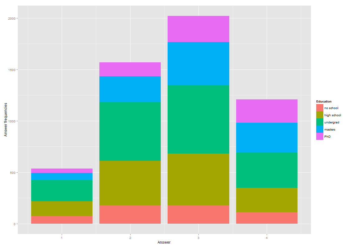 我有一个简单的数据框架,我通过从另一个更大的表(用cbind)绑定两列来创建这个框架。我的两列都有数值。第1栏(教育)有5个可能值(1=no学校、2=high学校、3=undergrad、4=masters、5=PhD)。第2栏(答案)有4个可能的答案。我想画一个情节,给我展示答案的例子,以某种方式想象出有500人接受过二级教育,回答了2,而100人接受过三级教育,只有10人接受过4级教育,只有10人回答了2;然后,1000人接受了3级教育,回答了5人,100人接受了4级教育,回答了5人等等。当我使用“表格”时,得出的数字是正确的: