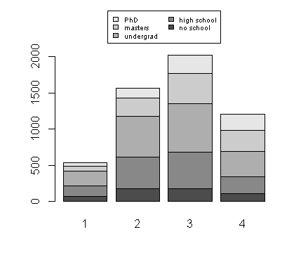 barplot(t(m), names.arg=1:4, legend.text=c("no school", "high school", "undergrad","masters","PhD"), args.legend=list(x='top', inset=c(0,-0.3), ncol=2, cex=0.6))